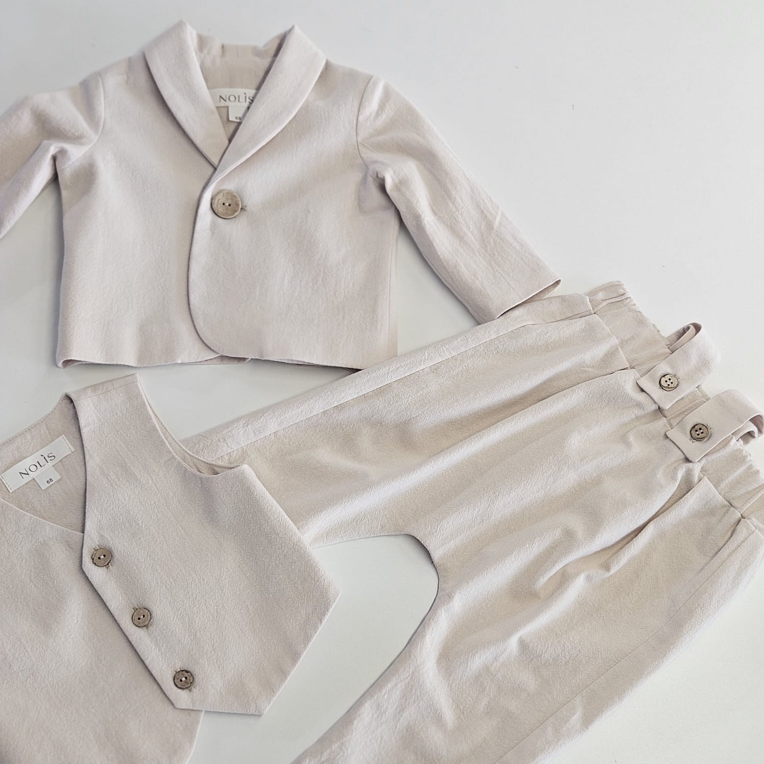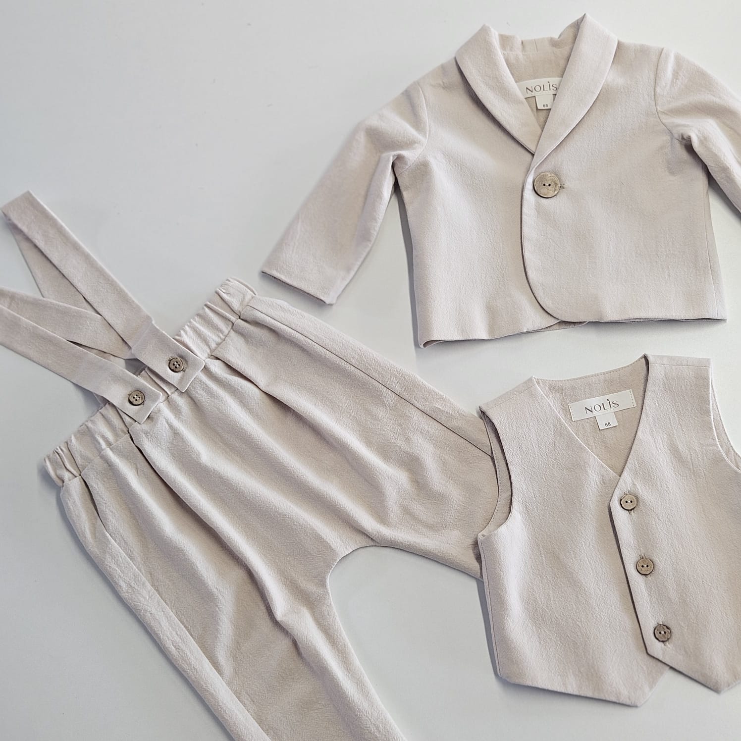 Descoperiți eleganța simplă cu costumul de botez pentru băieți, confecționat din bumbac de cea mai bună calitate. Designul clasic și confortabil asigură că micuțul dumneavoastră va arăta impecabil în această zi specială.