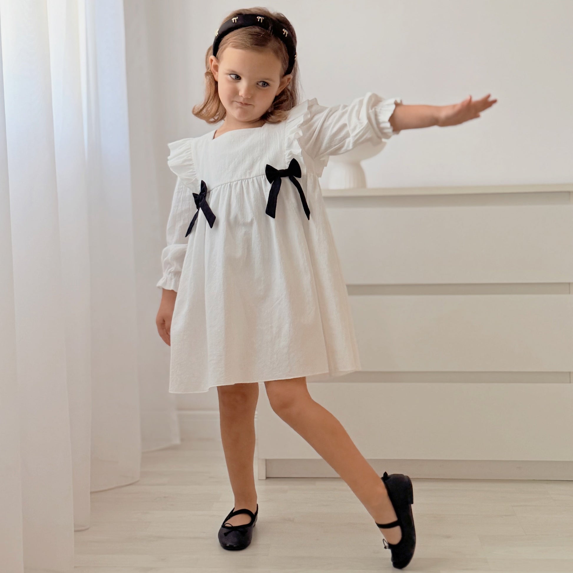 Detaliile contrastante ale celor două fundițe negre transformă această rochiță simplă într-o alegere rafinată, potrivită pentru momente speciale sau pentru apariții deosebite.